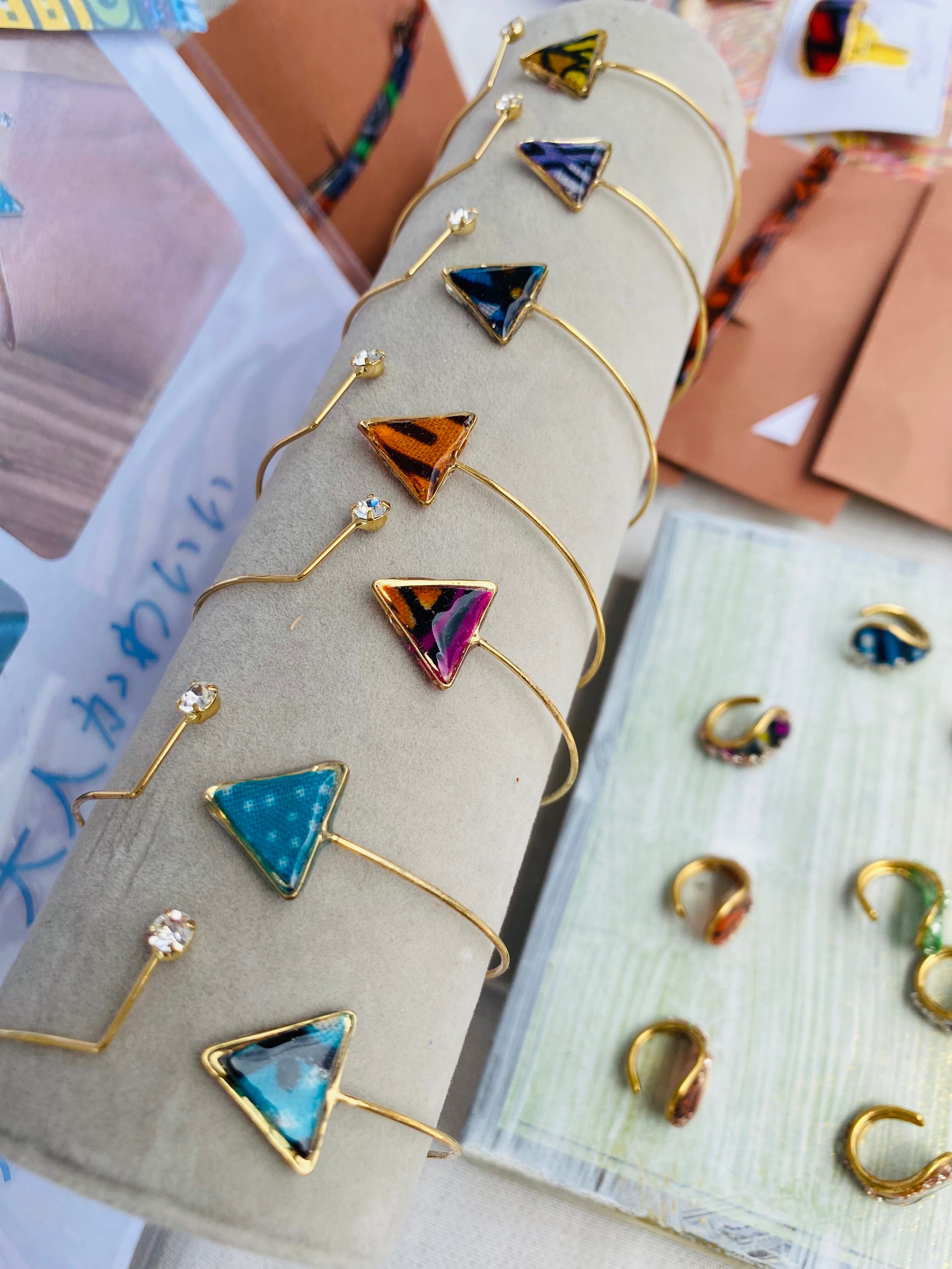 細くて華奢なバングルに1cmほどの三角形のアフリカ布をほどこしました。